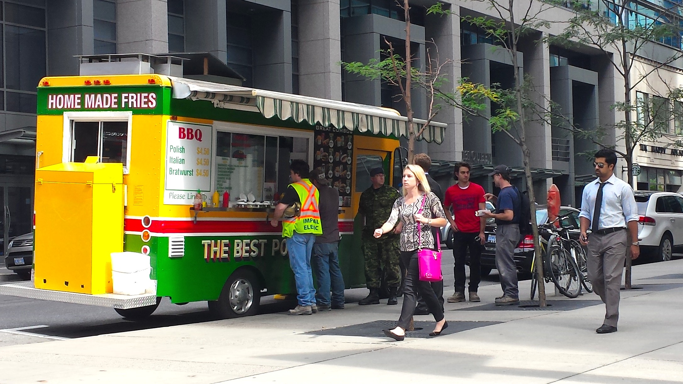 He’s wearing a neon yellow vest, a hardhat sits next to him on the bench, and he balances a small cardboard box filled with a hot dog, a can of Coca-Cola and French fries. The smell of ketchup and grease comes as much from his meal as from the nearby food truck, The Best Fries in Town.